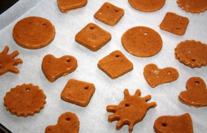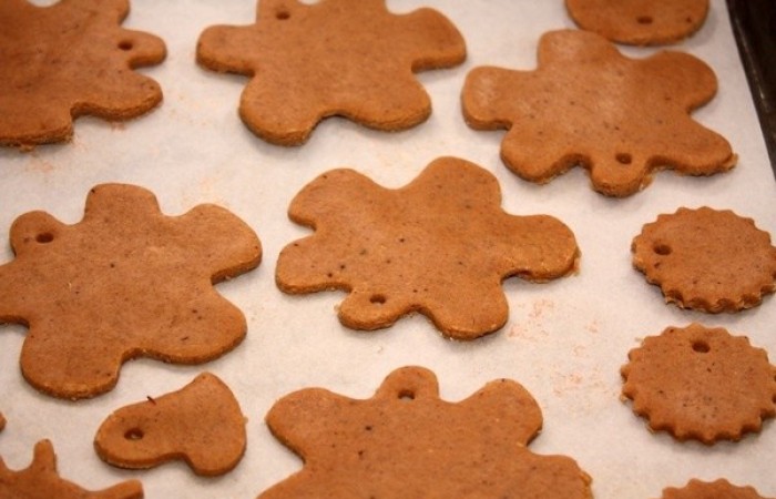 7Подучившиеся фигурки выкладываем на противень, застеленный пергаментом, и делаем на каждой отверстие (например, с помощью трубочки), чтобы пряник можно было просунуть через нитку и повесить на елку.