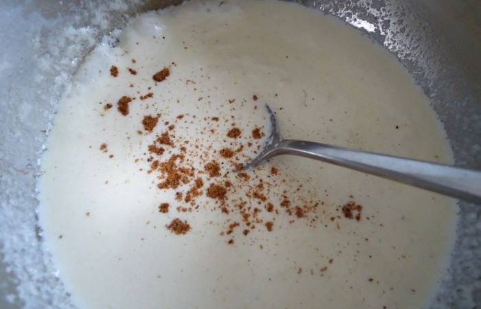 5Затем вливаем сливки и специи по вкусу. Взбиваем все венчиком и прогреваем на огне несколько минут.