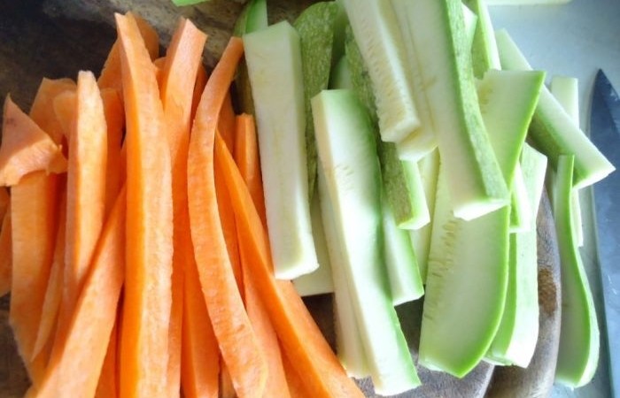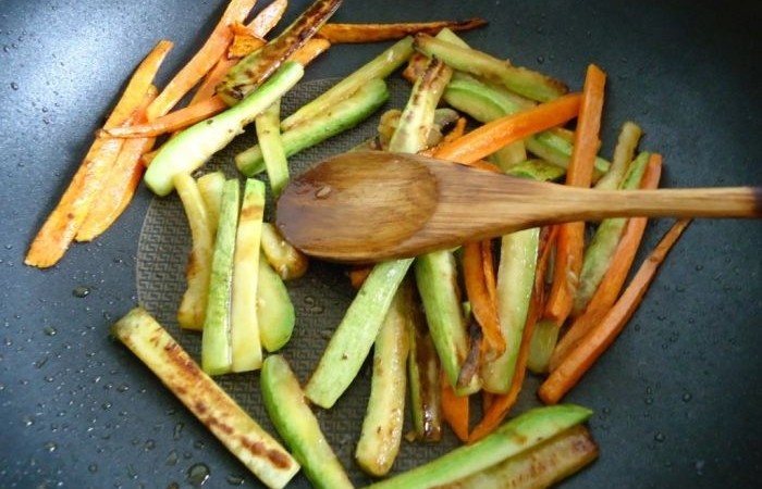 7Обжариваем овощи на растительном масле в течение 4-5 минут, периодически помешивая. Солим, перчим.