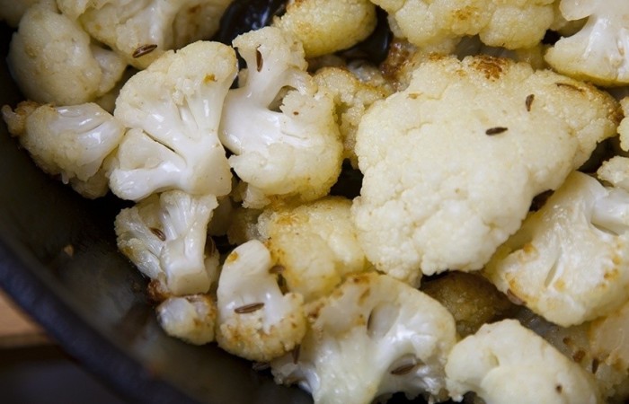 2Капусту разбираем на соцветия и обжариваем с тмином до мягкости в течение 10 минут, периодически помешивая.