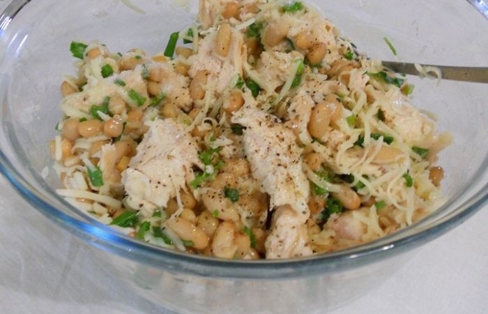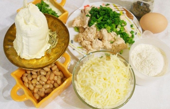 4Готовим начинку. Куриное филе нарезаем небольшими кусочками и смешиваем с фасолью и половиной тертого на крупной терке сыра. Солим, перчим. Добавляем сметану и немного рубленой зелени. Тщательно все перемешиваем.
