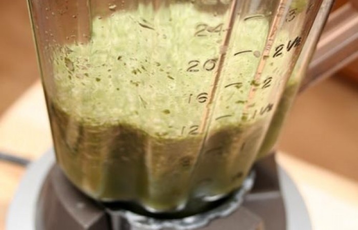 3Выкладываем кинзу в чашу блендера, добавляем стакан бульона и измельчаем до однородной консистенции.