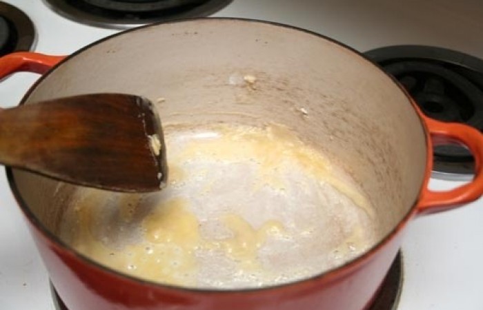 4В кастрюлю выкладываем сливочное масло, растапливаем и добавляем муку. Постоянно мешаем смесь в течение минуты.