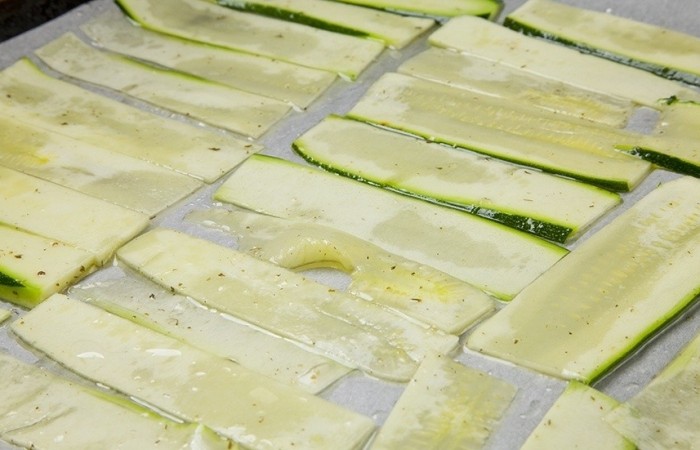 2Цукини режем тонкими дольками с помощью специальной терки или острого ножа. Смазываем цукини растительным маслом и выкладываем на противень, застеленный пергаментом. Отправляем в духовку на 10 минут, предварительно разогретую до 180 градусов.