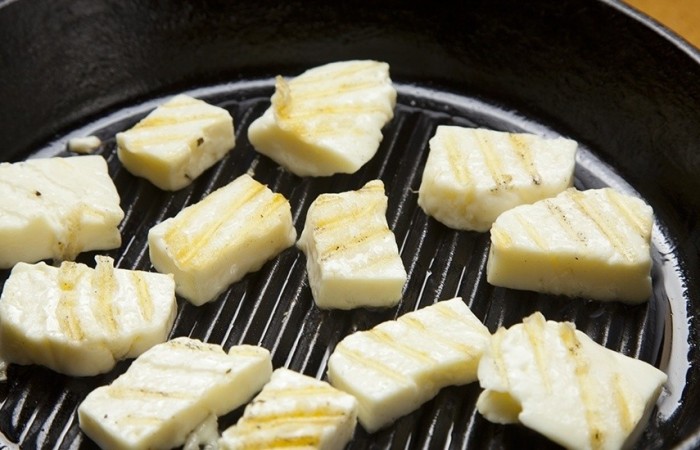 3Тем временем сыр режем кусочками и обжариваем на гриле или сковороде около минуты с каждой стороны.