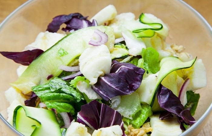 4Выкладываем в салатницу лук полукольцами, цукини и сыр. Добавляем листья салата. Заправляем лимонным соком и оливковым маслом. Солим, перчим по вкусу и подаем к столу. Салат с сыром Халуми готов. Приятного аппетита!