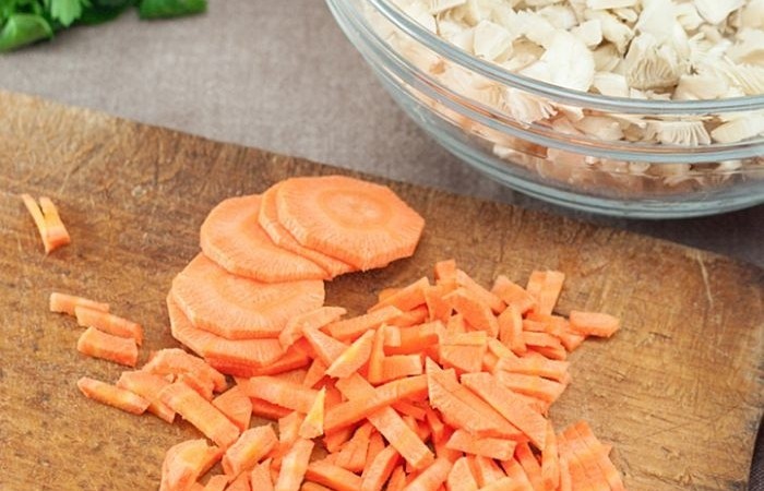 2Вешенки тщательно промываем, даем стечь и нарезаем мелкими кубиками.