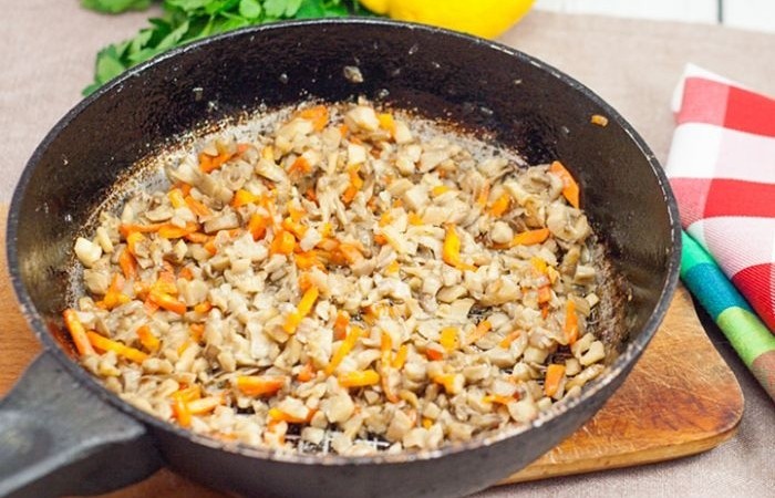 4Грибы с морковью обжариваем до готовности в течение 12-15 минут, периодически помешивая. Солим, перчим по вкусу.