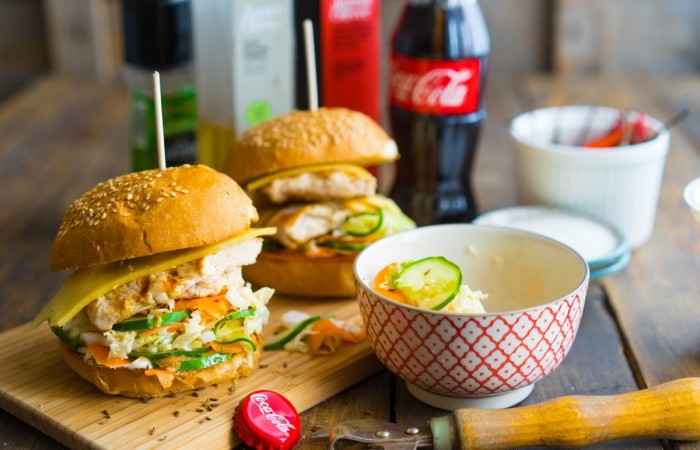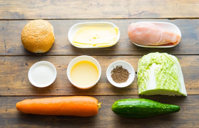 10Формируем гамбургер. Нижнюю половину смазываем йогуртом. Затем выкладываем промаринованные овощи. Затем кладем сыр, куриную отбивную и снова сыр. Накрываем верхней частью булочки и наслаждаемся. Приятного аппетита!