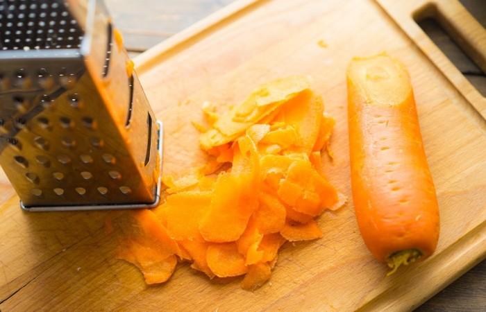 4Морковь трем на широкой терке, чтобы получились тонкие пластины.