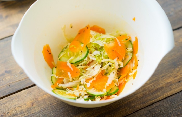 5В глубокой емкости смешиваем овощи. Добавляем уксус, тмин и сахар. Тщательно все перемешиваем. Оставляем мариноваться.