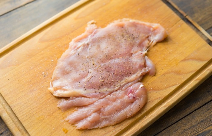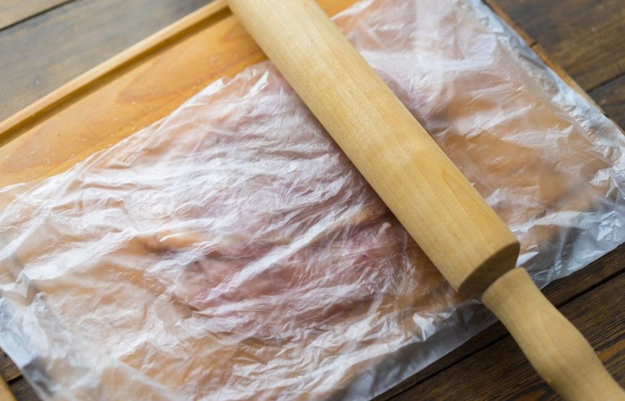7Филе промываем, обсушиваем. Накрываем полиэтиленовым пакетом и отбиваем.