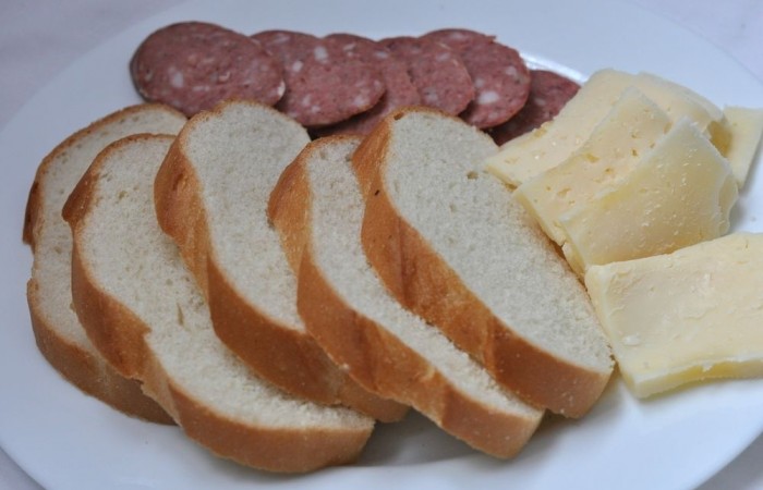 1Подготавливаем необходимые ингредиенты для бутербродов. Колбасу с сыром нарезаем пластинами. Батон по желанию тоже можно разрезать пополам.