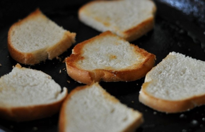 3Когда одна сторона поджарится - выкладываем на батон колбасу и сыр. Накрываем сковороду крышкой и готовим несколько минут.