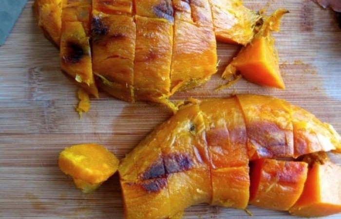 1Батат нарезаем небольшими квадратами и отправляем запекаться в духовку на 30 минут при 180 градусах.