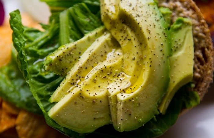 4Авокадо нарезаем тонкими ломтиками и приправляем.