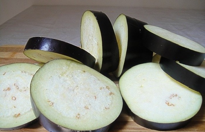 2Баклажаны нарезаем кружочками. Солим и даем настояться. Промываем под холодной водой и обжариваем с двух сторон.