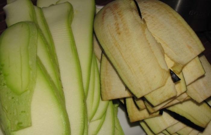 1Кабачки с баклажанами нарезаем тонкими пластинами. Баклажаны замачиваем в соленой воде, чтобы убрать горечь, а кабачки просто солим.