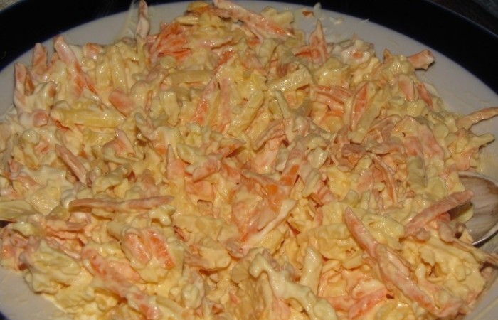 2Готовим начинку. Сыр с морковью трем на крупной терке. Добавляем пропущенный через пресс чеснок и заправляем все майонезом. Тщательно перемешиваем.