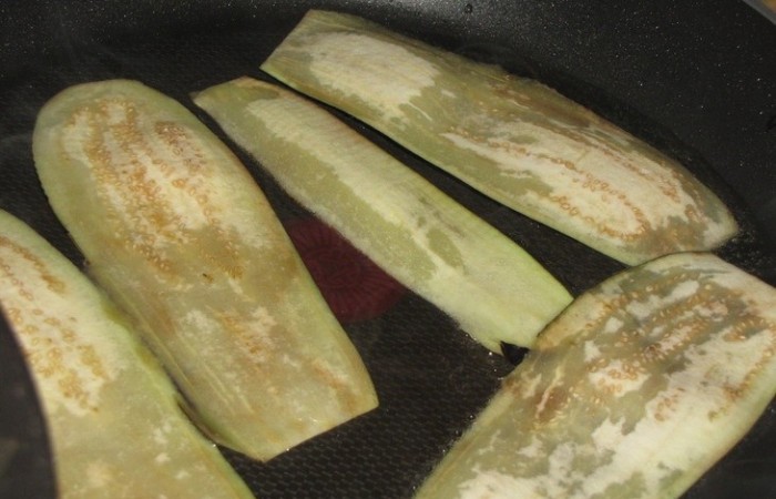 3Отдельно обжариваем кабачки и баклажаны и выкладываем на бумажное полотенце, чтобы убрать остатки масла.