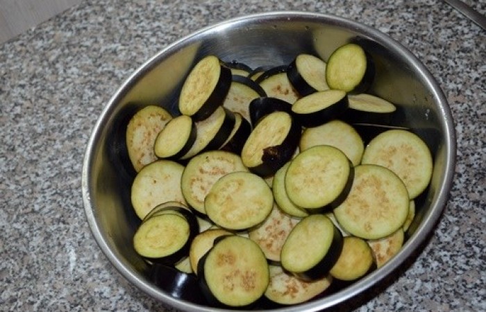 1Баклажаны промываем, обсушиваем и нарезаем ровными колечками. Выкладываем баклажаны в миску и заливаем холодной водой. Солим и оставляем на 30 минут.