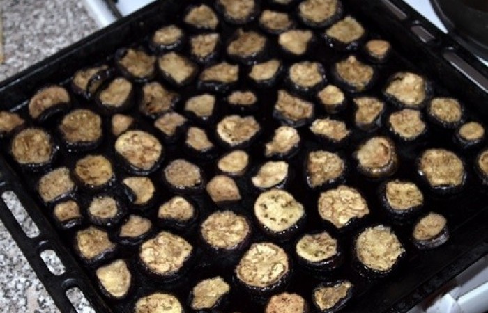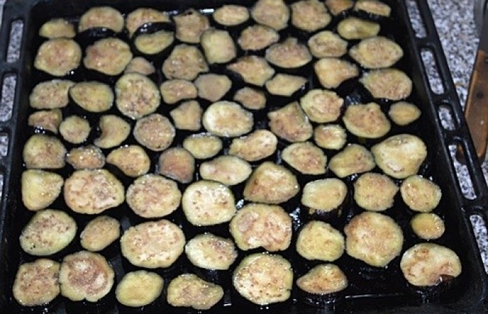5Баклажаны промываем, обсушиваем и выкладываем на противень, обильно смазанный растительным маслом. Каждый кусочек баклажана обмакиваем в масло. Отправляем в духовку на 25 минут, предварительно разогретую до 190 градусов.