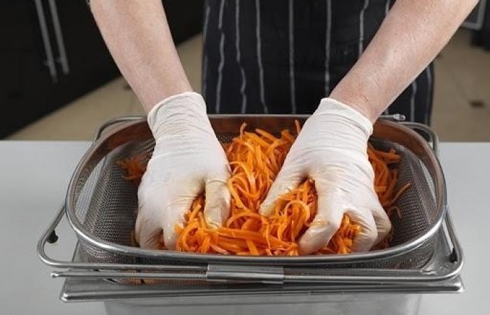 11Морковь выкладываем в сито и снова отжимаем.