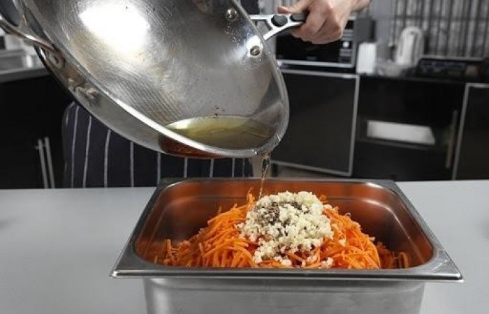 12Выкладываем морковь в форме горки обратно в емкость. Добавляем чеснок со специями. Затем вливаем горячее масло, ароматизированное луком.