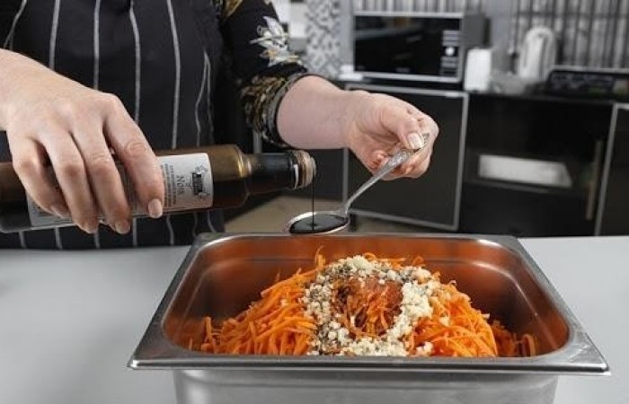 5Перемешиваем морковь с солью (мять ее при этом не нужно).