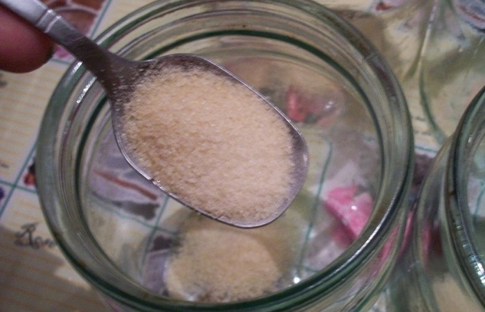 7На дно каждой пол-литровой баночки кладем по 2 ч.л. желатина.