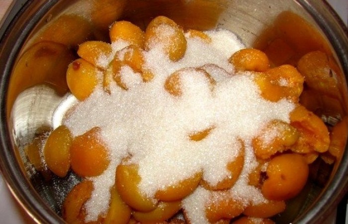 2Разрезаем абрикосы пополам, извлекаем косточки и выкладываем в кастрюлю. Засыпаем все сахаром и ставим кастрюлю на огонь. Доводим до кипения и делаем минимальный огонь.