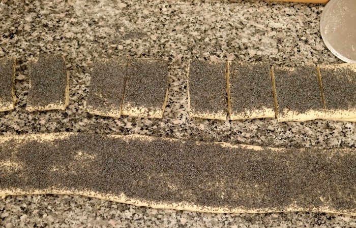 2Каждый из трех получившихся рулетов смазываем взбитым яйцом и посыпаем маком. Затем нарезаем рулеты небольшими ломтиками. Выкладываем их на застеленный пергаментом противень и отправляем в духовку на 20 минут, предварительно разогретую до 180 градусов.