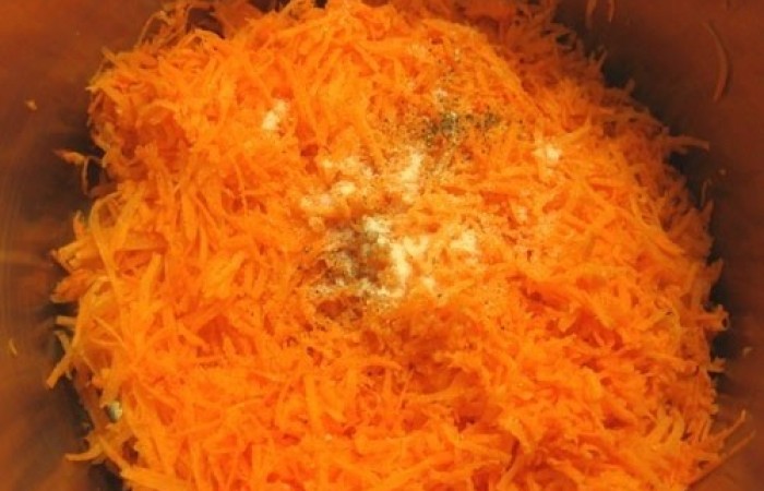 3Морковь трем на средней терке. Солим, перчим и тщательно все перемешиваем.