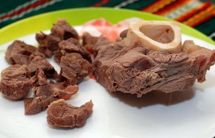 6Достаем говядину и нарезаем кубиками. Отделяем мясо от костей и добавляем обратно в бульон.