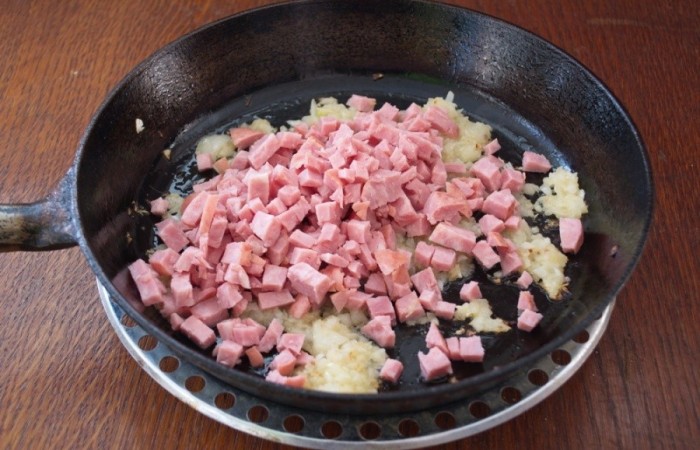 7Затем добавляем мелко нарезанные яйца и жарим еще несколько минут.
