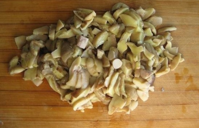 2Опускаем грибы в кипящую воду на 10 минут, а затем нарезаем мелкими кусочками. Лук тоже мелко нарезаем.