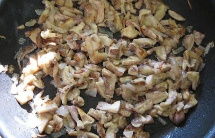 3На сливочном масле обжариваем лук в течение 3-4 минут, а затем добавляем грибы и жарим еще 5-6 минут, периодически помешивая. Солим, перчим по вкусу.