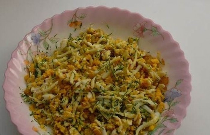 5Готовим начинку. Яйца трем на крупной терке и добавляем мелко нарезанный обжаренный лук. Также добавляем измельченный укроп.