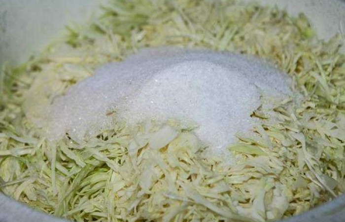 9Соль с сахаром всыпаем в капусту.