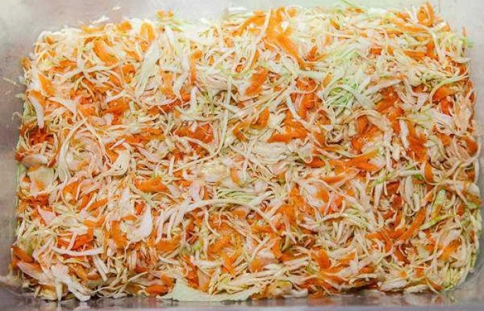 14Затем выкладываем часть капусты с морковью и тщательно все утрамбовываем.