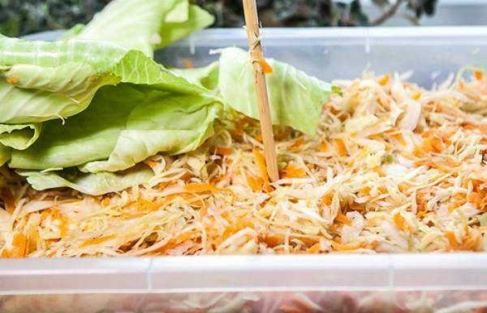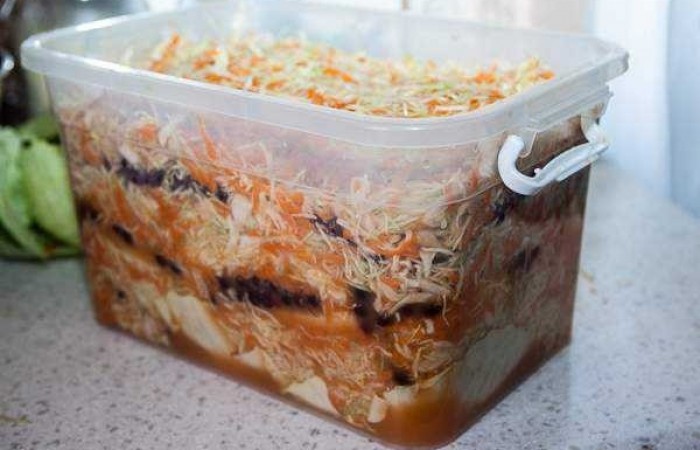 18Закрываем контейнер и ставим в теплое место на неделю. Раз в 2 дня протыкаем капусту в нескольких местах, чтобы выходил воздух. Рассол должен полностью покрывать верхний слой капусты. Если его будет мало - поставьте пресс.