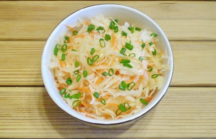 6Квашеная капуста готова. Подаем к столу с луком и растительным маслом. Приятного аппетита!