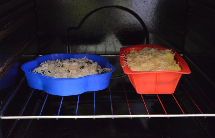 10Форму для запекания смазываем маслом и выкладываем половину пюре (мы использовали 2 формы, но можно взять одну большую).