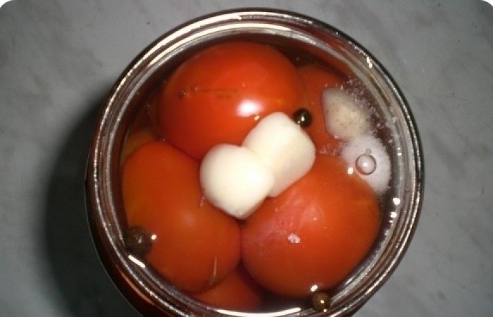 5после второго раза воду сливаем в кастрюлю ,а на помидоры выкладываем очищенный чеснок и перец горошком. Добавляем соль, сахар и уксус.