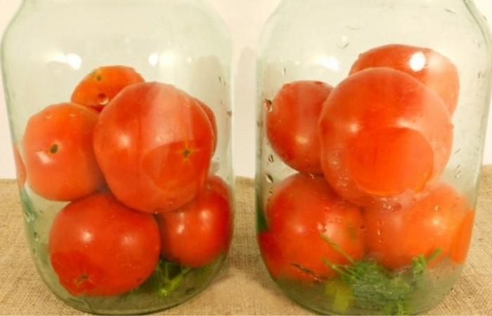 1На дно чистых банок кладем укроп с петрушкой. Заполняем банки на половину промытыми помидорами.