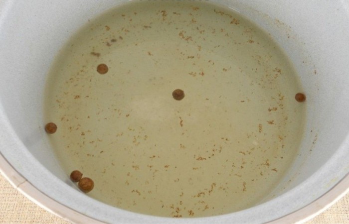4Банки заливаем горячей водой и оставляем на 10 минут. Затем сливаем с банок воду в кастрюлю. Добавляем соль, сахар, перец, корицу и яблочный уксус.