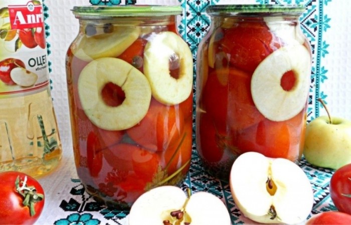 Маринованные помидоры с яблоками на зиму - безумно вкусная закуска с насыщенным вкусом и необыкновенным ароматом. Яблоки отлично подчеркивают вкус консервации. Смотря какой вы сорт яблок выберете (кислый, сладкий), вкус заготовки и получится соответствующим.