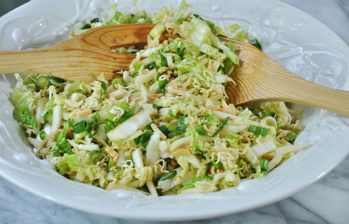 Этот простой салат из пекинской капусты особенно подойдет для любителей легкой еды. Зелень с орехами и вермишелью отлично дополняют вкус салатика, а пикантная заправка на основе оливкового масла, соевого соуса и уксуса вносит неповторимую изюминку.