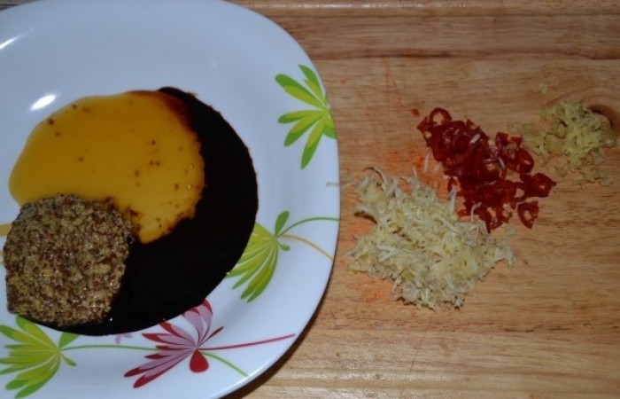 2Готовим маринад. Смешиваем соль, тертый имбирь, пропущенный через пресс чеснок (3 зубчика), нарезанный мелко острый перец, мед, горчицу и соевый соус.