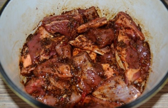 3Выкладываем мясо в маринад, перемешиваем и накрываем крышкой. Ставим в холодильник на ночь.